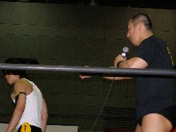 休憩明け、HANZOがリングに(右写真)。次回レッスルゲイトの大会のインフォメーションをしようとすると・・・