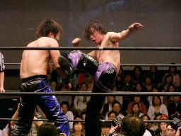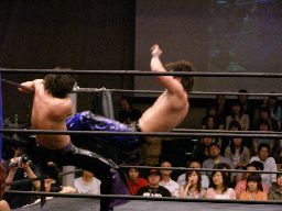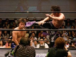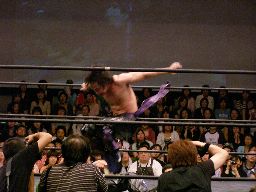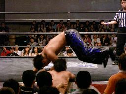 九頭の足をロープに固定してそこ目掛けてドロップキック(右写真)。カバーはカウント2。