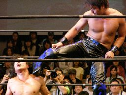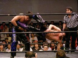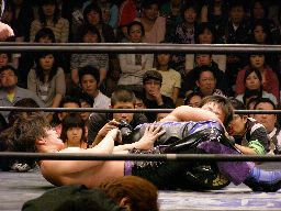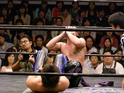 後方一回転してジャーマンに(左写真)、カウント2。5分経過。