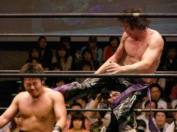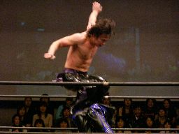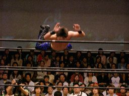 九頭コーナーに上ってダイビングダブルニーアタック(左写真)、カウント2。