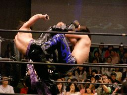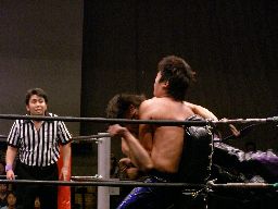 コーナーに上ってダイビングダブルニードロップ、HARASHIMAは両ヒザで受ける(右写真)。