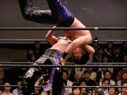 エプロンからトップロープを飛び越えようとしたところをHARASHIMAはキックで撃墜。エプロンに出た九頭をHARASHIMAはブレーンバスターで投げようとする(左写真)、九頭ブロックして逆に上げる、HARASHIMAブロック。