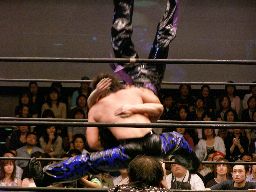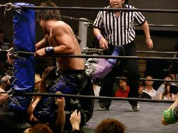 HARASHIMA再度上げる、九頭はその反動を利用してHARASHIMAの頭をエプロンに叩きつける(右写真)。この技は大阪の飯伏戦以来2度目か?リングに戻してカバー、カウント2。