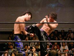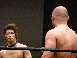 九頭立ち上がってチョップ(左写真)、HARASHIMAもチョップ、打ち合いになるがHARASHIMAが足を蹴ると九頭崩れ落ちる。