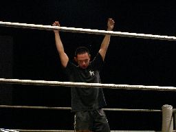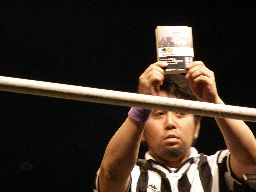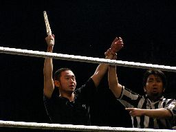 松井レフェリー改めて手を挙げる(右写真)。