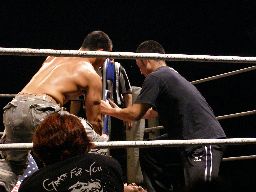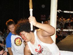2人がリングに入った頃にはすでに「5分経過。」坂井は諸橋を竹刀で殴打(右写真)。