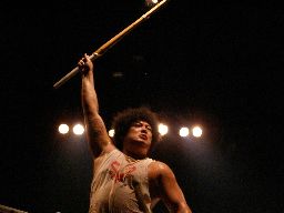 客席でアピール。腕のタトゥー?は自分の似顔絵(右写真)。