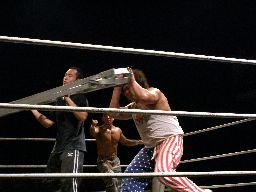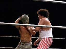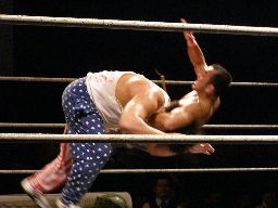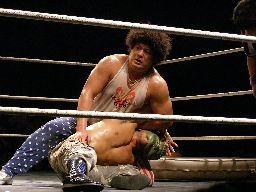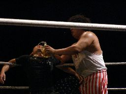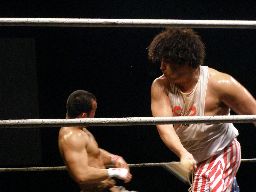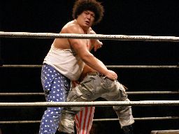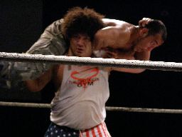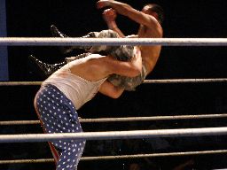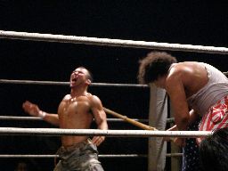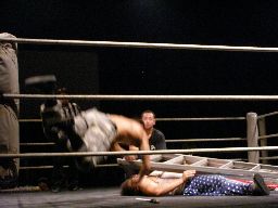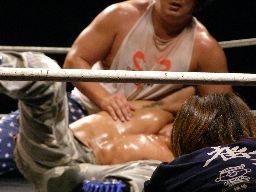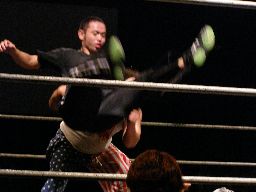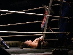 坂井は正美を捕らえてアトミックドロップのように抱え上げると諸橋の上にギロチンドロップの形で落とす(左写真)。「もう一発!」と叫んで抱え上げるが今度は正美をそのままバックドロップに。