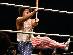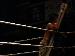 正美がラダーをかついで帰って来た(右写真)。しかし酔っているせいかなかなかリングに入れない。