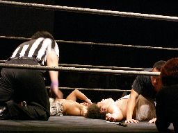 しかし諸橋もダメージでカバーに行けない。人間凶器の正美が恐る恐るカバーに行くと(右写真)松井レフェリーはこれを認めて3カウント。