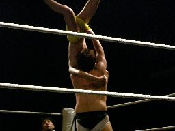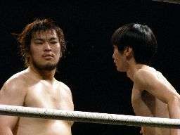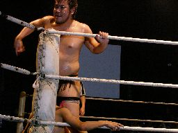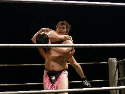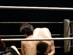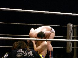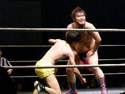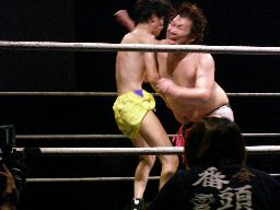 場外戦から藤岡は花道ラリアットに行くがディーノに吹っ飛ばされる(右写真)。