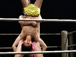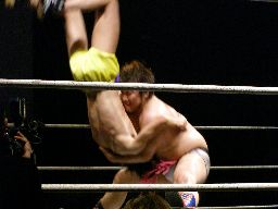 そしてスタナー(右写真)。うまく決まらないため何度も連発。