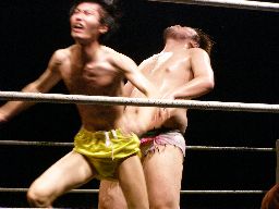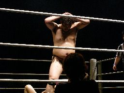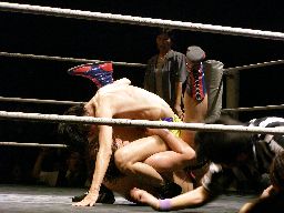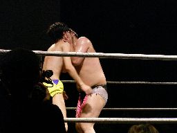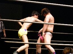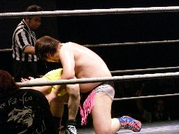 ディーノ再度男色ドライバー狙う、藤岡は急所打ち、ディーノ耐える(右写真)。藤岡は急所打ち連発。