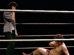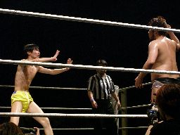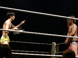 どういう試合なのか全く予想が付かなかったこのカード。藤岡はいつものテーマで入場ランプまでやってくるが、途中でテーマが「Fire」に変わり藤岡も社長の入場をコピー(右写真)。ちゃんと盛り上がる観客。