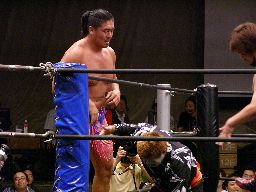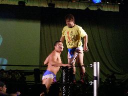 ディーノ首投げから「死ね〜♥」柿本ロープ。ディーノは男色クローに、柿本キャッチ、ブリッジで返すと一本背負い、高木にタッチ。