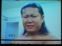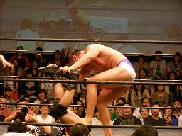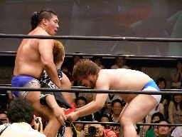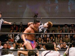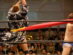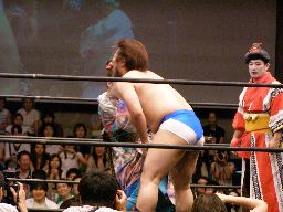 なんか知らんが脱ぎたがるゲイ想(右写真)。ゲイ想張り手、ロープでチョーク攻撃、ストンピング。ディーノにタッチ。