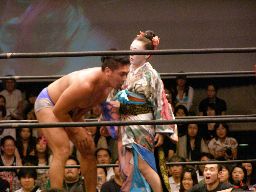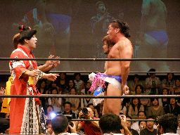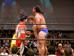ディーノが帯を引っ張ると柿本はくるくる回って「あーれー」状態(左写真)。柿本ナイス。