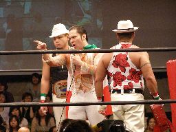 ジェット入ってクローズライン、ベルナルドブレーク。HARASHIMAが羽交い絞めにしてジェットがパンチ、ベルナルドかわしてHARASHIMAに誤爆。ベルナルドトーゴーにタッチ。トーゴーは2人にラリアット連発(左写真)。
