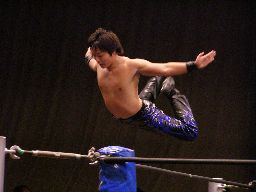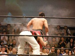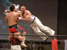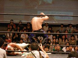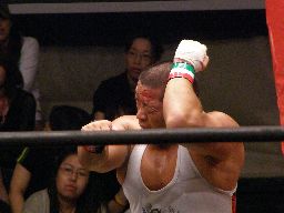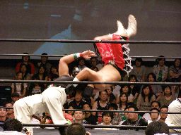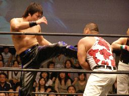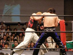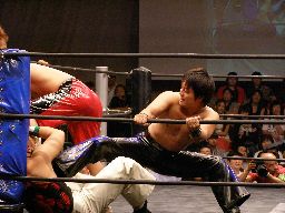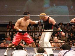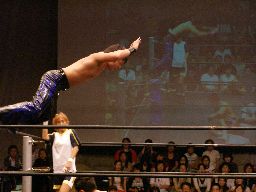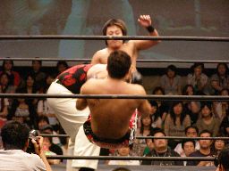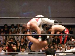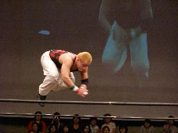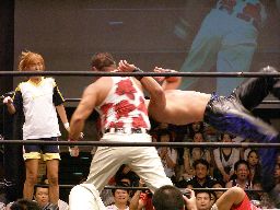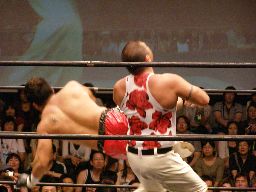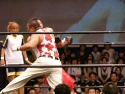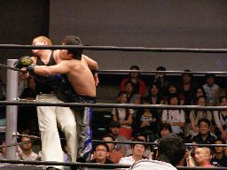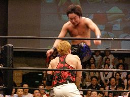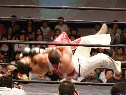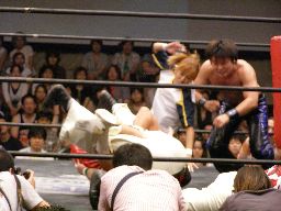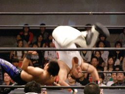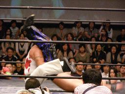 HARASHIMAコーナーに振る、トーゴー切返す、HARASHIMA突進をかわしてバックを取ると投げっ放しジャーマン、トーゴー一回転して着地(右写真)、トーゴー突っ込む、HARASHIMAかわしてトーゴーを場外に落とす。