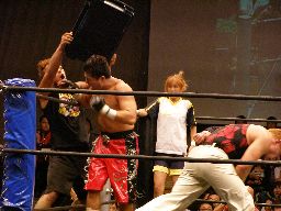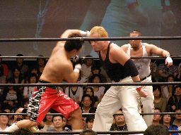 ベルナルドロープに飛ぶ、HARASHIMAがボックス攻撃。ジェットがパンチに行くがベルナルドかわしてHARASHIMAに誤爆(左写真)。15分経過。