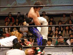 ジェットコーナーに上って合体パイルドライバー(右写真)、カウント2。