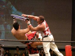 ジェットがシーソーホイップでトーゴーをHARASHIMAの肩の上に飛ばし、HARASHIMAは山折り(右写真)。