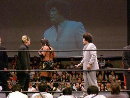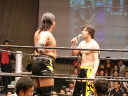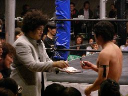 大鷲マイク。「今日はたくさんのサラリーマンのかたがたのおかげでベルトを防衛することができたこと、喜ばしく思います。」そして相手のKUDOをホメる。が、アクシデントとはいえ頭を打った後のKUDOにタイトル取れそうな勢いは全く感じられなかった。そこから復活して試合を成立させたとこまで含めての賛辞かもしれないが。
