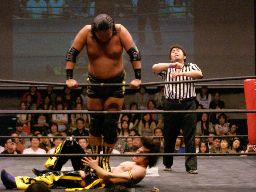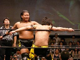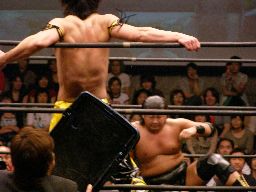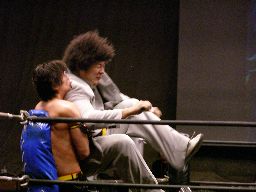 KUDOロープに飛ぶ、サラリーマンがブラックボックスで一撃(左写真)。KUDO客に張り手。会場からはブーイング。