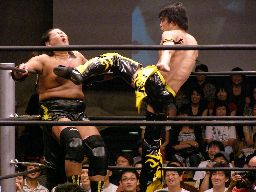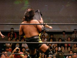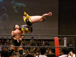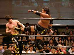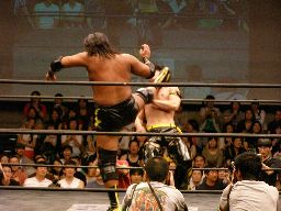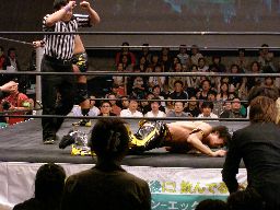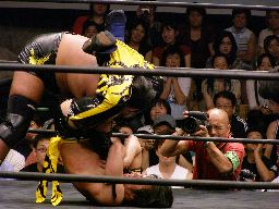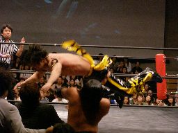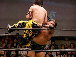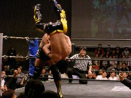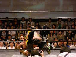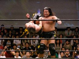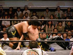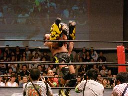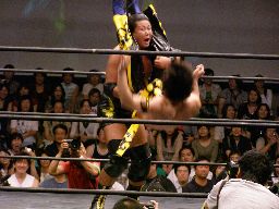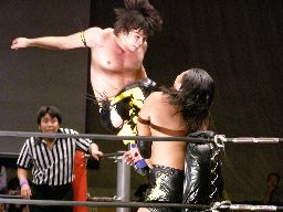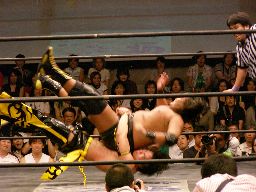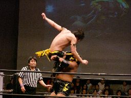 大鷲ランニングチョークスラム、KUDOは飛びついて三角絞めに(右写真)、しかし大鷲持ち上げて叩きつける。