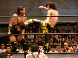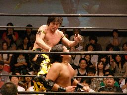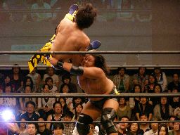 コーナーに振って串刺しダブルニー(右写真)。フィッシャーマンズスープレックス狙うが大鷲ブロック。10分経過。
