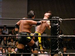 まずは場外戦。逃げ惑うサラリーマンの一団。大鷲はリングに戻して逆水平連打(左写真)。KUDOもチョップを返し打ち合いに。大鷲サミング、ヘッドロック。KUDOロープに振ってショルダーブロックの打ち合い。
