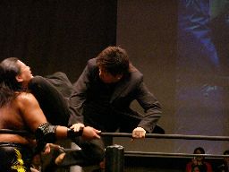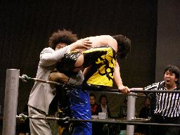 KUDOコーナーに上る、坂井が捕まえる(右写真)。その間に魔イケル、猪苦魔らはリング下にテーブルをセット。