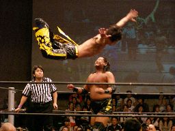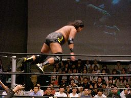 KUDO追撃のプランチャ(右写真)。しかし足元がおぼつかない。