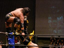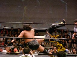 大鷲コーナーに上る、KUDOは下からドロップキック(左写真)。