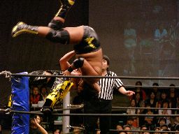 大鷲パワーボム、KUDO着地してロープに飛ぶ、大鷲カウンターのラリアット、KUDO逆上がりでかわして(右写真)逆さ押さえ込み、カウント2。