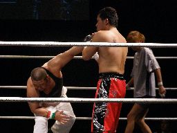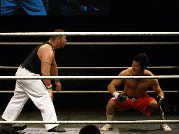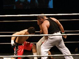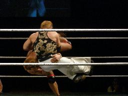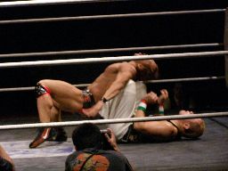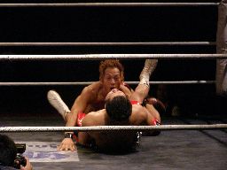 魔イケルヘッドロック、ベルナルドロープに振る、ロープワーク、ベルナルドがカニばさみで倒し(左写真)。ベルナルドは背中に乗ってストンピング連打。コーナーに振る、魔イケル切り返す、ベルナルド突っ込む、魔イケルショルダースルー。
