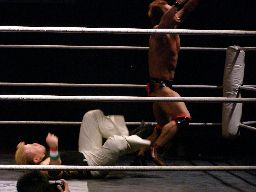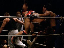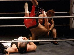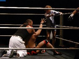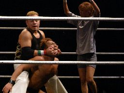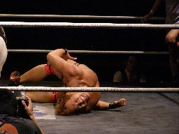 トーゴーラリアット、ジェットかわしてジャンボジェット、トーゴーブロックしてトラースキック、カウント2。トーゴーコーナーに上る、魔イケルが押さえようとするがトーゴーパンチで撃退。フロッグスプラッシュで飛ぶ、ジェットすでに立っている(左写真)。ジェット突っ込む、トーゴーカウンターのラリアット、カウント2。もう一発ラリアット、ジェットかわしてジャンボジェット、魔イケルにタッチ。