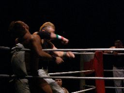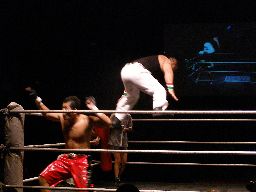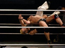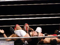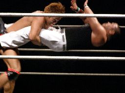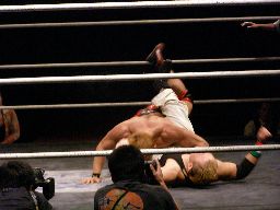 トップロープを滑らせてから(左写真)アトミックドロップ。ボディスラムで投げて倒れこみヘッドバット、トーゴーかわす。トーゴーはベルナルドにタッチ。