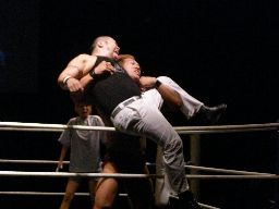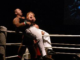 魔イケルボディスラムからベルナルドの股間にダブルレッグドロップ(右写真)。なぜか客に「お前も欲しいのか?」