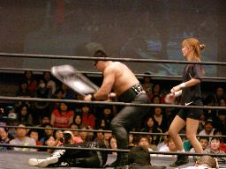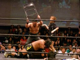 高木がイス攻撃(左写真)。MIKAMIがヒジを押さえてうめく。