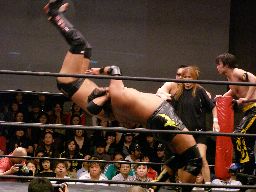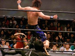 エプロンに出てスワンダイブプレス(右写真)、大鷲もギロチンを合わせる。KUDOがカット。