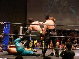 大鷲と蛇我井がダブルで矢郷をロープに振る、大鷲延髄蹴り(左写真)、