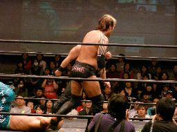 矢郷ブレーンバスター狙う、大鷲切り返す(右写真)。すかさずギロチンドロップ、カウント2。