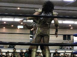 斗猛矢は鳥羽のパンチをキャッチしてロープ渡り(右写真)からホイップ。鳥羽ミドルキック連打、高梨にタッチ。