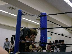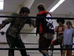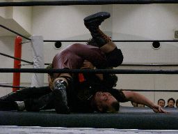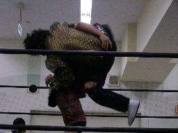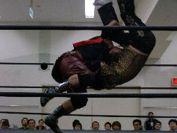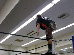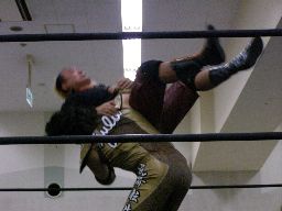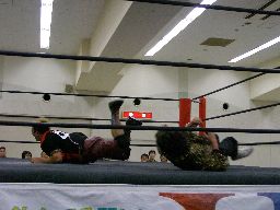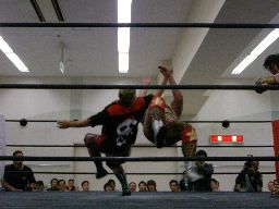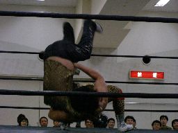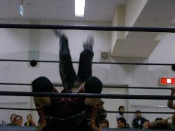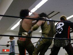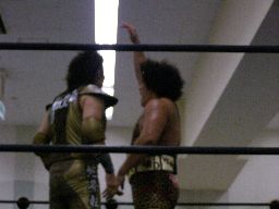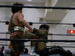 先発はゴージャスと猪熊。ロックアップ、猪熊がバック取る、ゴージャス切り返すが猪熊は腕をひねり上げる。ゴージャス切り返す、猪熊また返す。ゴージャスはネックスプリング?で起き上がると(右写真)ホイップ。猪熊はヘッドシザーズ。猪熊フライングメイヤー、ゴージャスもヘッドシザーズで返す。両群タッチ。