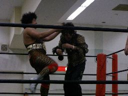 ポイズンと坂井ロックアップ、すぐにブレーク。再度ロックアップ、ポイズン自ヘッドロック、坂井ショルダーブロック、ポイズン耐える(左写真)。