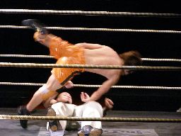 ベルナルドコーナーに上ってフロッグスプラッシュ(右写真)、カウント2。