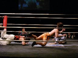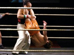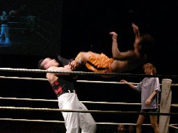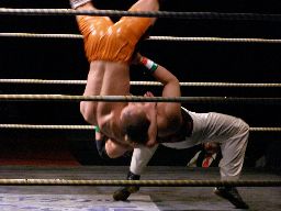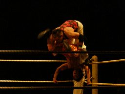 ベルナルドコーナーに上る、高梨は倒立式フランケンシュタイナー(左写真)。この技見るの久しぶりだな。ベルナルドは客席にエスケープ。