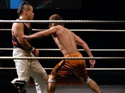 ベルナルド延髄蹴り(左写真)、しかし高梨はすぐにトラースキック。