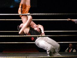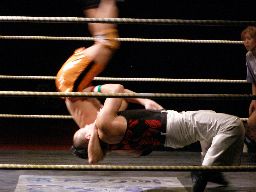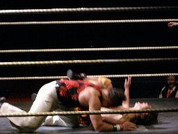 カタプルパでロープにぶつけ、倒れこんだところにヒザ(右写真)。カバーはカウント2。